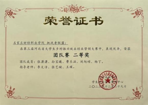 • 第三届河北省大学生乡村振兴就业创业营销大赛团队赛二等奖