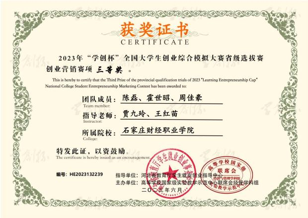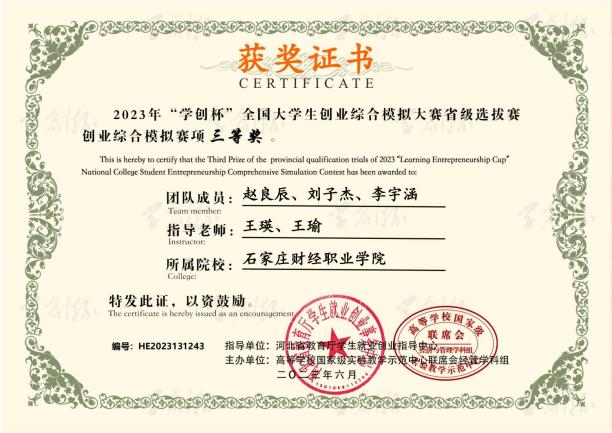 • 2023年“学创杯”全国大学生创业综合模拟大赛省级选拔赛创业综合模拟赛项三等奖
