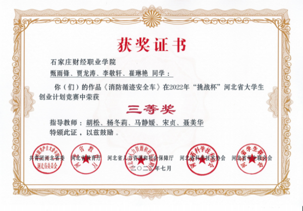 • 2022年“挑战杯”河北省大学生创业计划竞赛三等奖