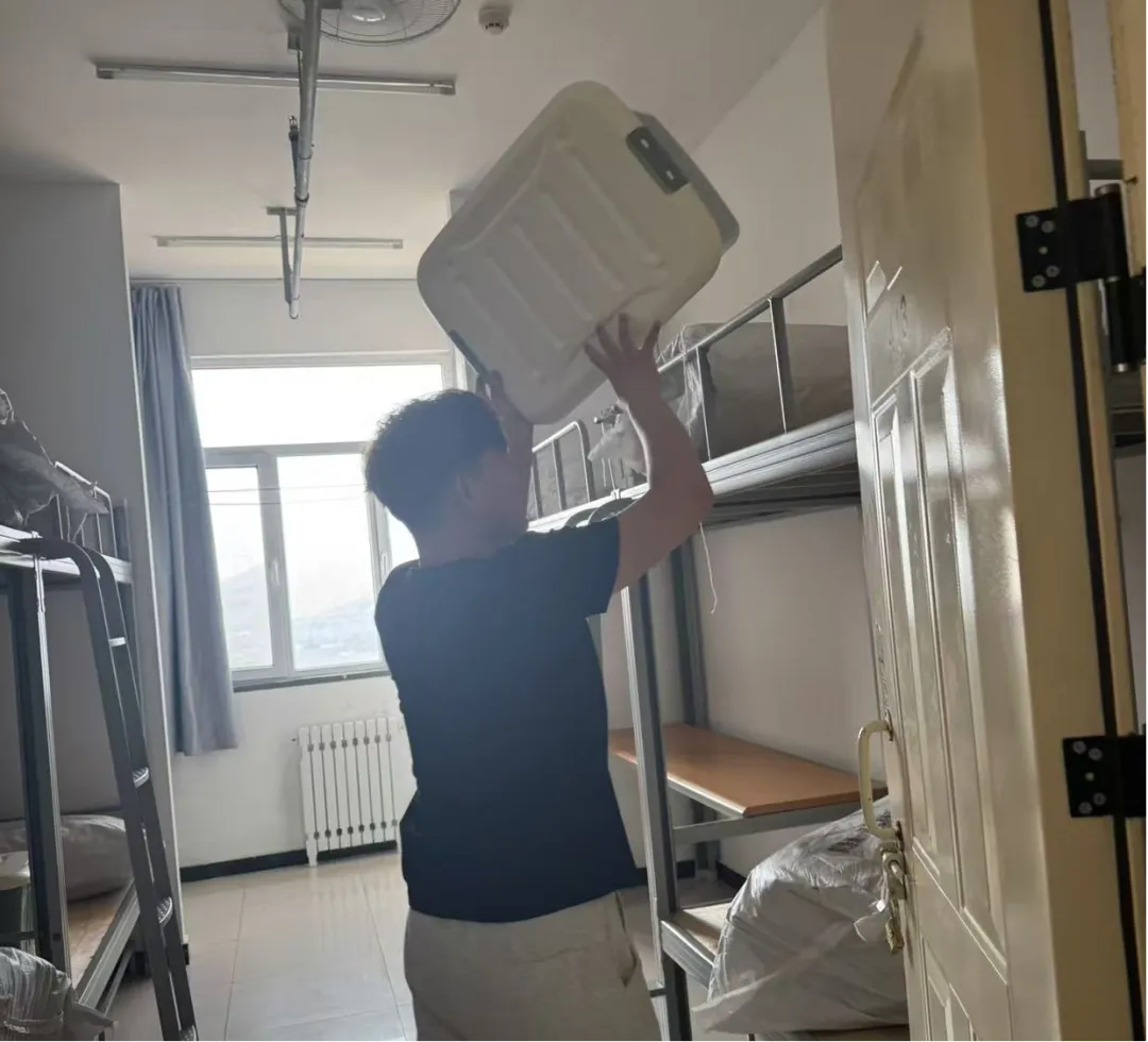 活动筹备阶段,学院党总支精准对接新生住宿信息,提前梳理各楼栋、各楼层的被品数量与分配清单,制定“分楼栋、定区域、包楼层”的志愿服务方案。学生党员志愿者们提前熟悉新生宿舍分布,以小组为单位,有序前往指定地点领取新生被品。搬运过程中,志愿者们分工协作,或手提、或肩扛,仔细核对每一套被品的信息标签,确保准确送达对应宿舍,并将被品整齐摆放至宿舍床位,同时顺带检查宿舍内基础设施情况,及时反馈需调整的细节问题,用严谨与耐心为新生打造“拎包入住”的便利条件。