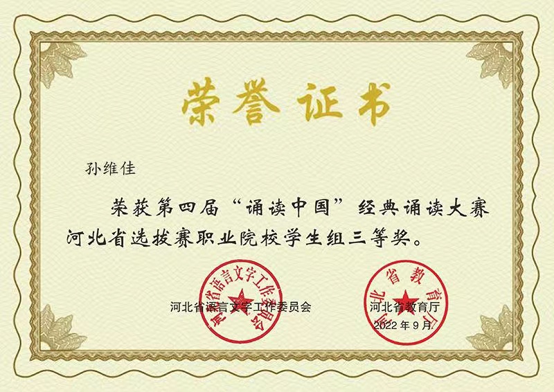 第四届“诵读中国”经典诵读大赛河北省选拔赛职业院校学生组三等奖
