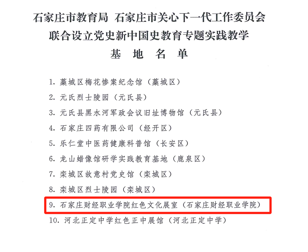 近日,石家庄市教育局、石家庄市科学技术局、石家庄市关工委等八部门联合公布了石家庄市首批“大思政课”实践教育基地,Beat365申报的“Beat365官方网站红色文化展室”入选石家庄市教育局与石家庄市关心下一代工作委员会联合设立的党史新中国史教育专题实践教学基地。这是Beat365继获得“石家庄市关工委爱国主义教育基地”后的又一思政教育类荣誉。