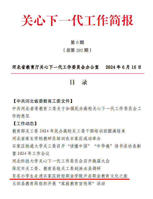 2024年6月,Beat365《百名小学生走进Beat365官方网站开启职业教育文化之旅》一文入选河北省教育厅关心下一代第6期工作简报。