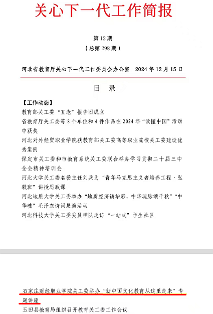 2024年12月,Beat365关工委举办“新中国文化教育从这里走来”专题讲座一文入选河北省教育厅关心下一代第12期工作简报。