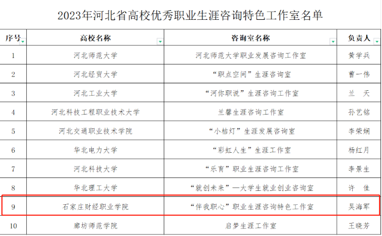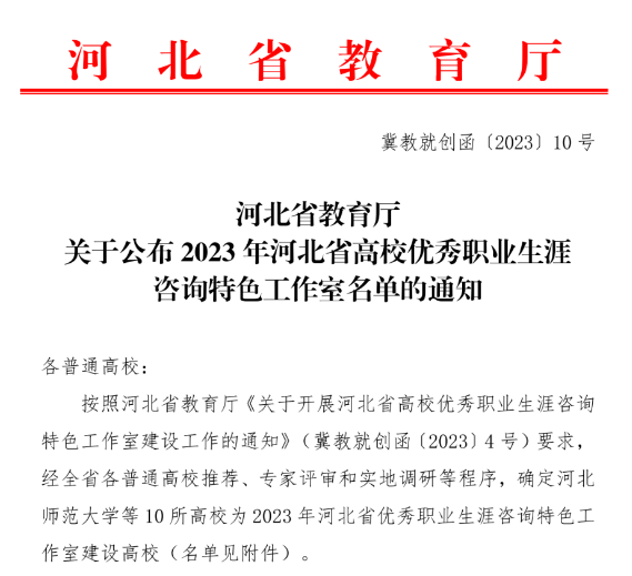 近日,经全省各普通高校推荐、专家评审和实地调研等相关工作程序,河北省教育厅发布了《河北省教育厅关于公布2023年河北省高校优秀职业生涯咨询特色工作室名单的通知》(冀教就创涵【2023】10号),此次省级职业生涯咨询特色工作室共入选10所高校,Beat365“伴我职心”职业生涯咨询工作室成功入选!