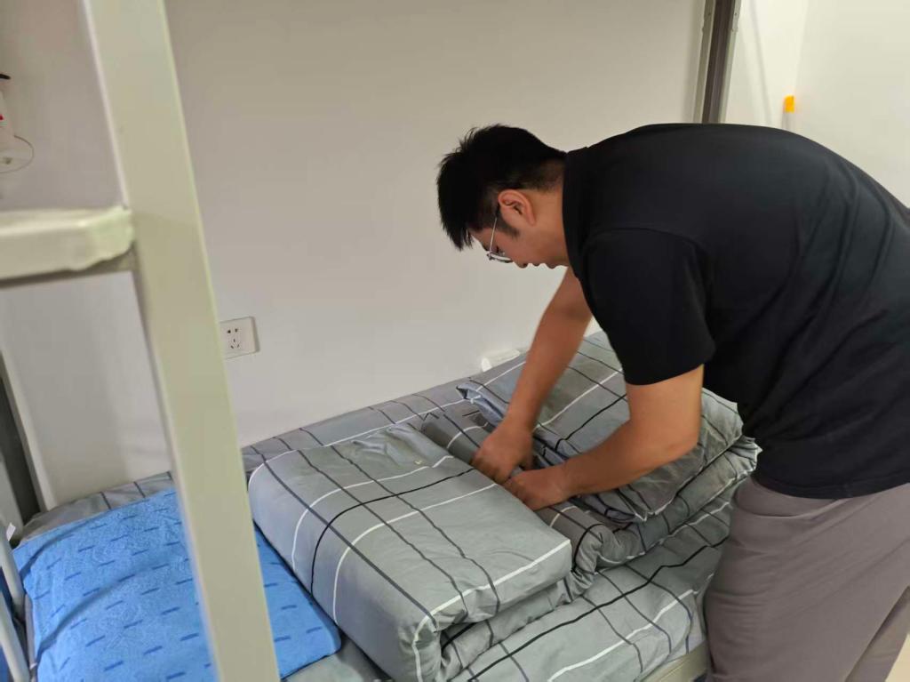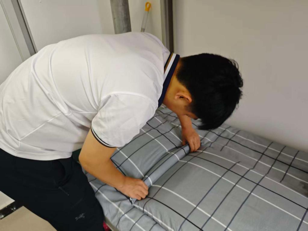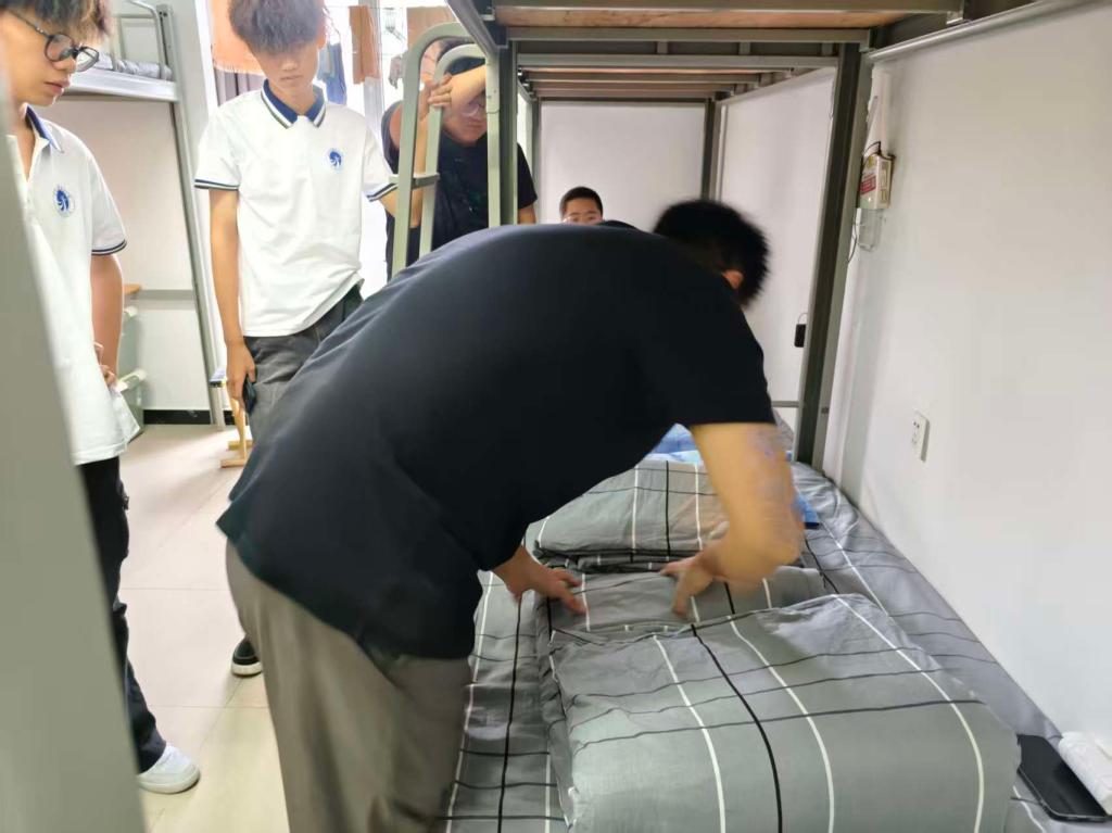 除了叠被子,辅导员还针对物品摆放、卫生清洁等方面进行细致指导。“书桌要分区,常用的书本放在桌面右侧,文具放进收纳盒,私人物品要摆放整齐,不能随意堆放。”“洗漱用品要按顺序排列,毛巾挂在指定位置。” 辅导员们逐床检查,对不符合规范的地方及时指出,并现场示范正确的整理方法。新生们认真聆听,积极按照要求调整,原本略显杂乱的宿舍渐渐变得窗明几净、井然有序。