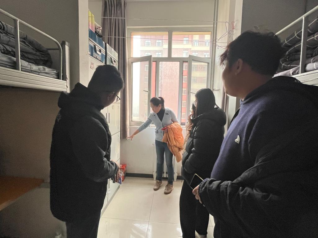 在检查过程中,我院党总支书记郝艳在与同学们亲切交流,询问他们的学习和生活情况,关心他们在宿舍生活中遇到的问题。对于发现的安全隐患,郝艳在书记和辅导员们现场提出整改要求,并督促学生立即整改。