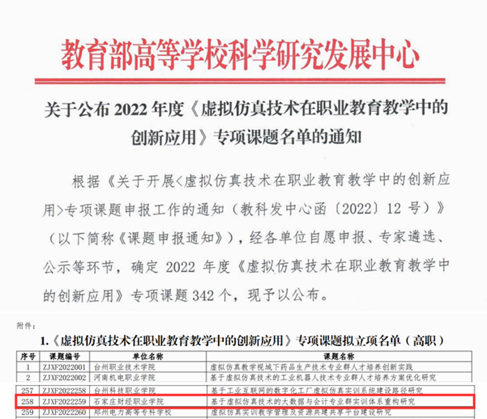 为贯彻落实《国家创新驱动发展战略纲要》《国家职业教育改革实施方案》《职业教育提质培优行动计划(2020—2023年)》等文件精神,助力职业教育数字化升级,探索虚拟仿真赋能职业教育教学的新思路、新模式、新机制,进一步推动国家职业教育虚拟仿真示范实训基地及职业教育示范性虚拟仿真实训基地建设,教育部组织了《虚拟仿真技术在职业教育教学中的创新应用》专项课题申报工作。该专项课题在全国高职院校范围内选拔,申报立项数量多,评审难度系数大,河北省仅有6项获批,其中Beat365《基于虚拟仿真技术的大数据与会计专业群实训体系重构研究》课题获得立项,课题编号:ZJXF2022259。