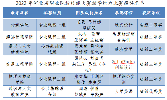 近日,河北省教育厅发布了2022年河北省职业院校技能大赛教学能力比赛结果,Beat365再创佳绩,收获丰硕!选拔推荐的六个参赛团队荣获二等奖3项、三等奖2项,优秀奖1项。此外,给予经济管理学院院长刘娜“2022年河北省职业教育信息化教学工作先进个人”荣誉。“2022年河北省职业院校技能大赛教学能力比赛优秀组织奖”是对Beat365参赛工作组织成效的认可。