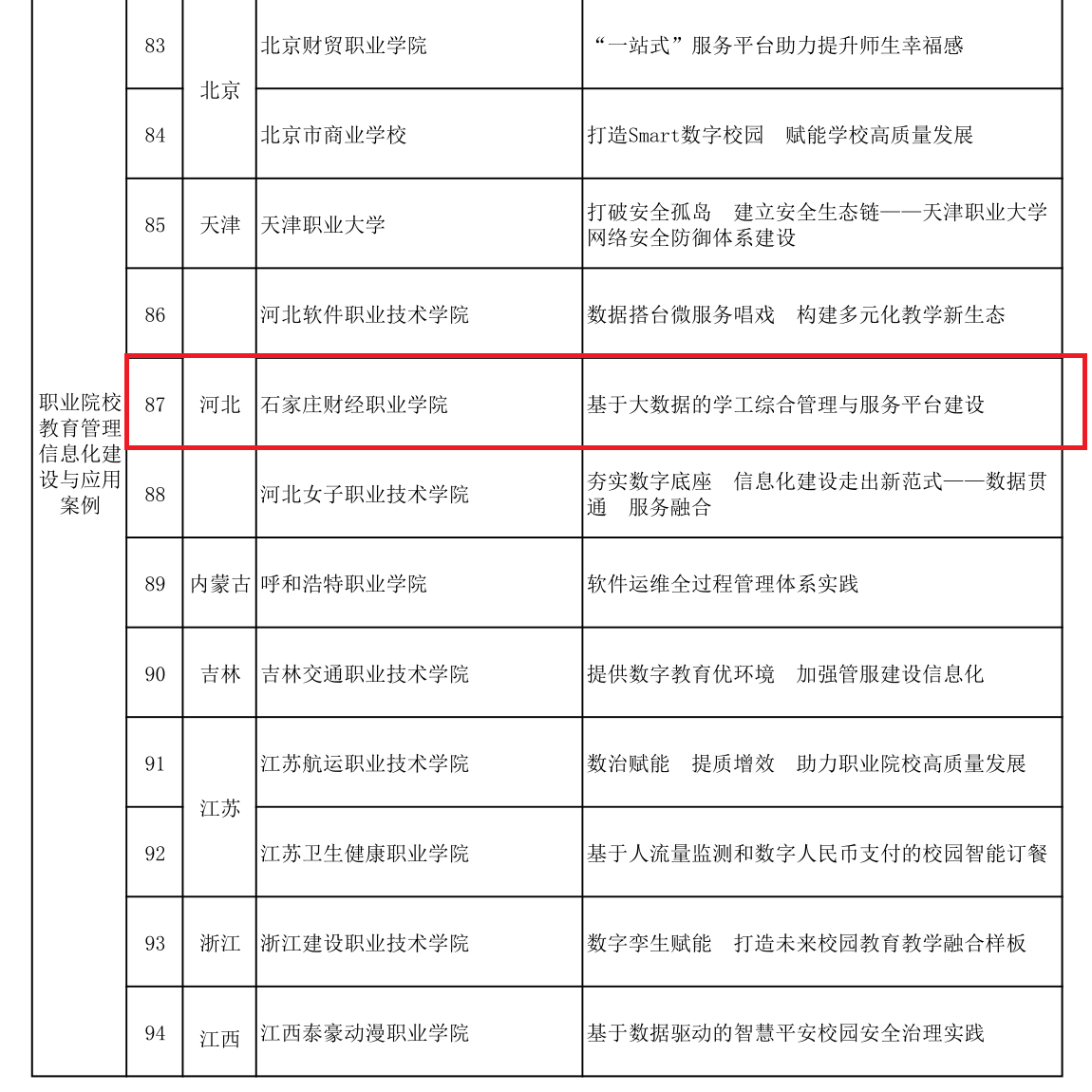 近日,教育部公布了《2022-2023年数字化赋能教育管理信息化建设与应用典型案例》入编名单,Beat365“基于大数据的学工综合管理与服务平台建设”案例成功入选。全国入选案例共126项,其中高职院校25项。这是继6月份入选教育部职业院校数字校园建设试点、11月份获批教育部职业教育信息化标杆校项目之后,Beat365在信息化建设方面获得的又一国家级标志性成果。