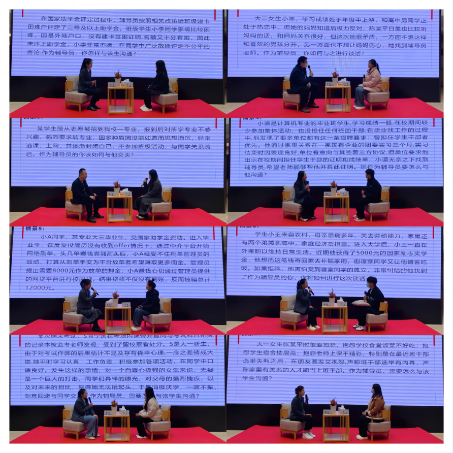 此次谈心谈话比赛采用真实案例,结合辅导员日常工作内容,从学生思想理论教育和价值引领、学生日常事务管理、大学生心理健康教育、职业规划与就业创业指导等方面还原现实谈话场景,参赛辅导员们结合工作实践经验,熟练运用谈心谈话技巧,引导谈话对象正确认识并合理解决学习生活中遇到的各种问题。