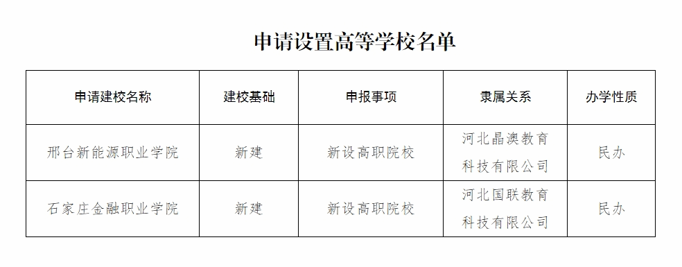 根据《中华人民共和国高等教育法》《普通高等学校设置暂行条例》《高等职业学校设置标准(暂行)》等有关规定,经河北省高等学校设置评议委员会专家考察和评议,新设邢台新能源职业学院、石家庄金融职业学院事项获得通过,现将学校名单向社会公示。