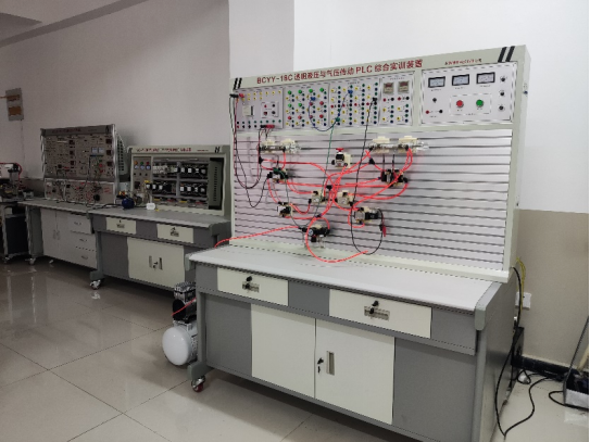 本实训室主要承担《液压与气压传动》课程实训教学,实训内容涵盖了液压技术、传统继电器控制技术、时间继电器技术、PLC 自控技术、传感器应用技术等多项技术,可使学生用最短时间,以最快的速度,有兴趣地学习与掌握液压与气动元器件,并学会搭建典型液压与气动控制回路。
