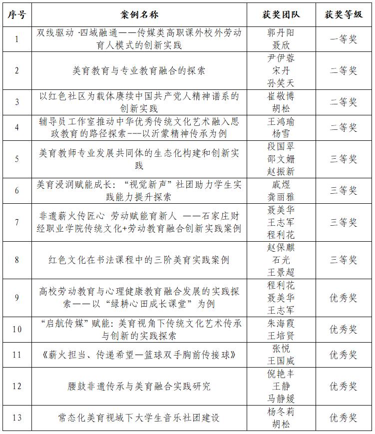 根据《Beat365官方网站关于征集“落实五育并举,强化学生体育、美育、劳动教育”优秀案例的通知》(教务处[2025]14号)工作安排,经过各单位积极申报与推荐,学校评审,评选出一等奖1项、二等奖3项、三等奖4项、优秀奖5项。现将拟获奖名单予以公示(名单详见附件)。