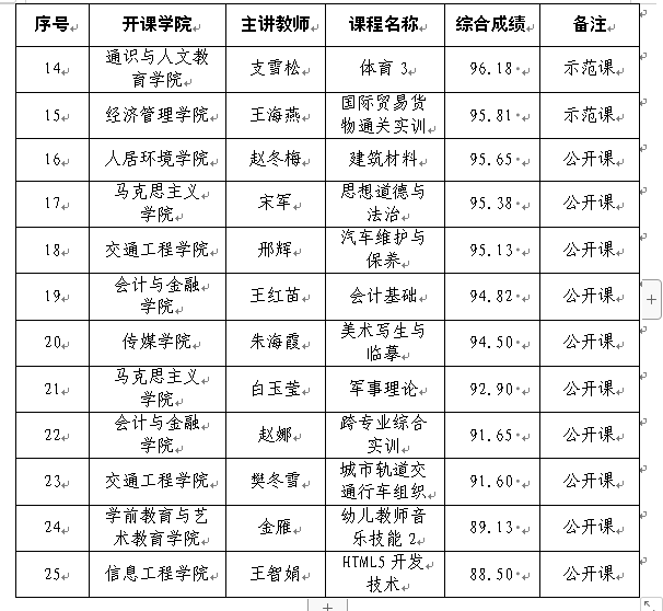 根据《Beat365官方网站关于开展教学公开课活动的通知》,10月16日至10月29日,教务处组织开展了公开课活动,各学院教师和校级评委组成听评课小组,对25名学院推荐的教师授课情况进行了综合评价,并按得分从高到低确定张宁、武儒哲等15名教师的课程为示范课,赵冬梅、宋军等10名教师的课程为公开课,现将结果通报如下: