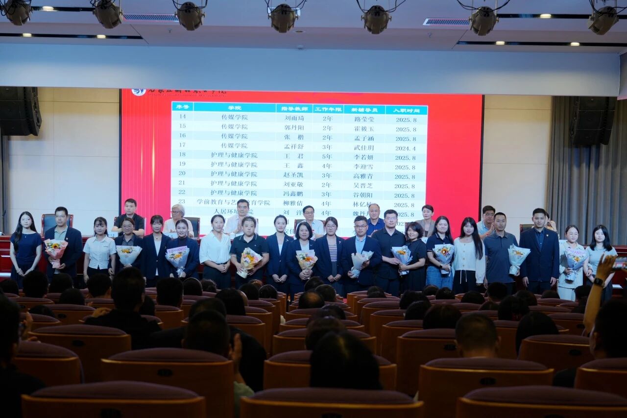 在“以老带新”师徒结对仪式中,新教师代表向指导教师代表献花,赓续教育家精神,传承教师使命。会计与金融学院辅导员宋云梦、经济管理学院教师李寒分别作为指导教师和新教师代表发言,她们表示,将通过“以老带新”活动构建起一个共享教学智慧、传承育人经验的桥梁。薪火相传,凝心聚力,成长为有理想信念、有道德情操、有扎实学识、有仁爱之心的“四有”好老师。学生朗诵、歌曲祝唱等环节深情表达了对老师的崇高敬意,将现场气氛推向高潮。