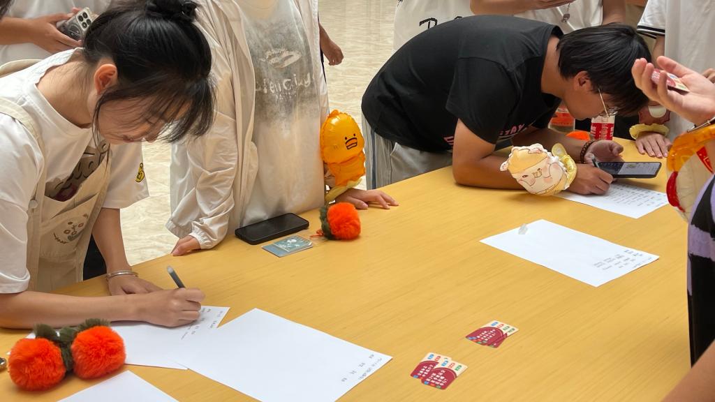 百科知识竞答区同样人气高涨。在图书馆二楼大厅的百科区,出题人拿着卡牌对答题人进行提问,记录员认真负责地记录答对次数。奖品根据答对题目的数量进行分类设置,小于 5 道、5 至 10 道、11 至 15 道分别对应不同的奖品。师生们积极参与,展现了丰富的知识储备和求知欲望。