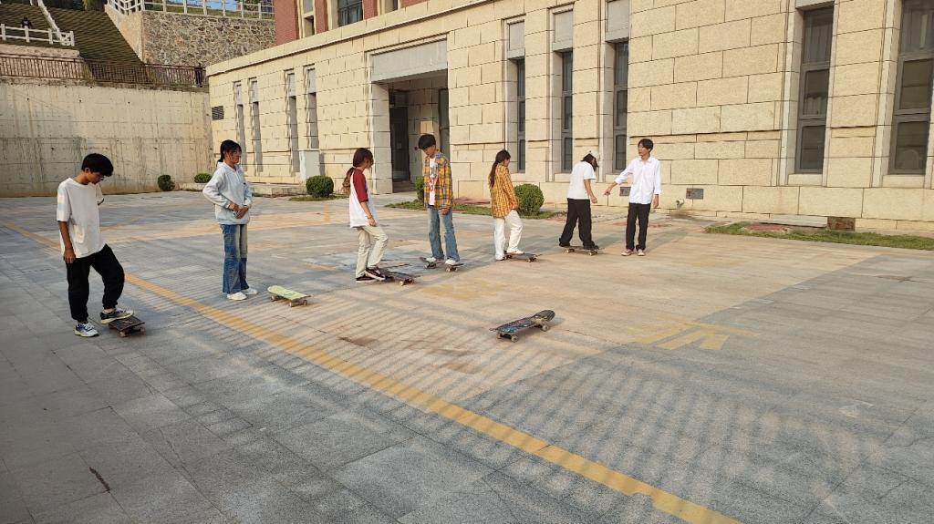 在教学环节,滑手们勇敢尝试,挑战自我。社长结合自身的滑板教学经验为大家指导动作,同学们体验了滑板的乐趣,领略到了“哪怕摔倒也要站起来面对困难”精神。让同学们在滑板的过程中,收获了成长和自信。