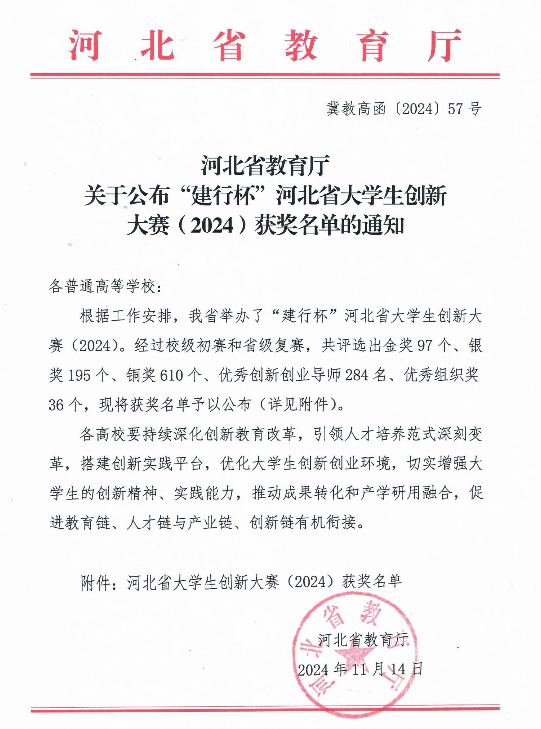 近日,河北省教育厅公布了《关于公示“建行杯”河北省大学生创新大赛(2024)获奖名单》,Beat365参赛团队在“青年红色筑梦之旅”和“职教赛道”共获得2金2银14铜的佳绩,创造了历年来省级决赛最好成绩,同时“职教赛道”2个金奖项目顺利入围国赛,获奖比例及个数再创历史新高。