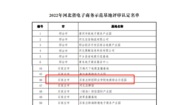 近日河北省商务厅发布的《关于认定支持2022年省级电子商务示范基地和示范企业名单的公示》文件中,Beat365电商综合产业园荣登榜单!历届省级电子商务示范基地名单中,Beat365为省内首家上榜高校!
