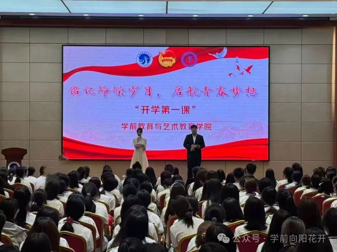 铸魂·传承篇章,伴随着庄严的国歌声,五星红旗冉冉升起,在场师生满怀崇敬之情行注目礼。随后,主持人深情讲述抗战精神,回顾世界反法西斯胜利80周年的光辉历史,带领大家缅怀先烈、致敬英雄。学前教育与艺术教育学院宋丹院长以《赓续红色血脉,铸就师艺匠心》为题发表讲话,她首先代表学院全体师生员工,向2025级新同学表示热烈欢迎和诚挚祝贺。她提到,同学们踏入大学校门的这一年,恰逢中国人民抗日战争暨世界反法西斯战争胜利80周年,开展“开学第一课”,首要的就是回望历史,缅怀先烈,从苦难辉煌中汲取智慧滋养和前进力量,让红色基因融入青春血脉。作为学前教育与艺术教育学院的学子,肩负着特殊使命。学前教育是人生成长奠基工程,关乎国家和民族未来;艺术教育是美化心灵、陶冶情操、激发创造的事业。同学们未来是孩子的启蒙者、美的传播者、人类文明薪火传递者,不仅要掌握扎实专业知识和娴熟技能,更要涵养“爱与责任”的师者仁心,锤炼“真善美”的艺术品格。学院会提供优质学习资源、实践平台和成长环境,希望大家将个人艺术理想与国家教育发展结合,把家国情怀化为勤奋学习实际行动,成长为有理想信念、道德情操、扎实学识、仁爱之心的新时代卓越师资和艺术人才。