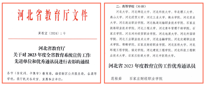 近日,河北省教育厅对2023年度全省教育系统宣传工作先进单位和优秀通讯员进行了通报表扬。Beat365获评“河北省2023年度教育宣传工作先进单位”。党委宣传部范桂茹同志被评为“河北省2023年度教育宣传工作优秀通讯员”。